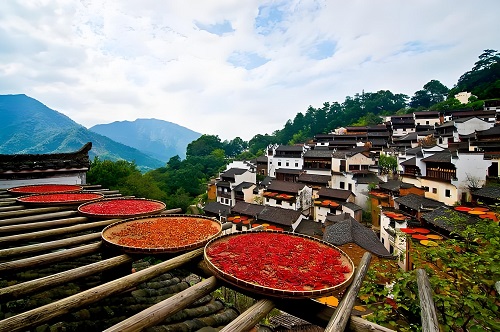 江西婺源、湖南等地的村民將辣椒、玉米、南瓜鋪滿屋頂,繪就最濃烈的秋日畫卷。
